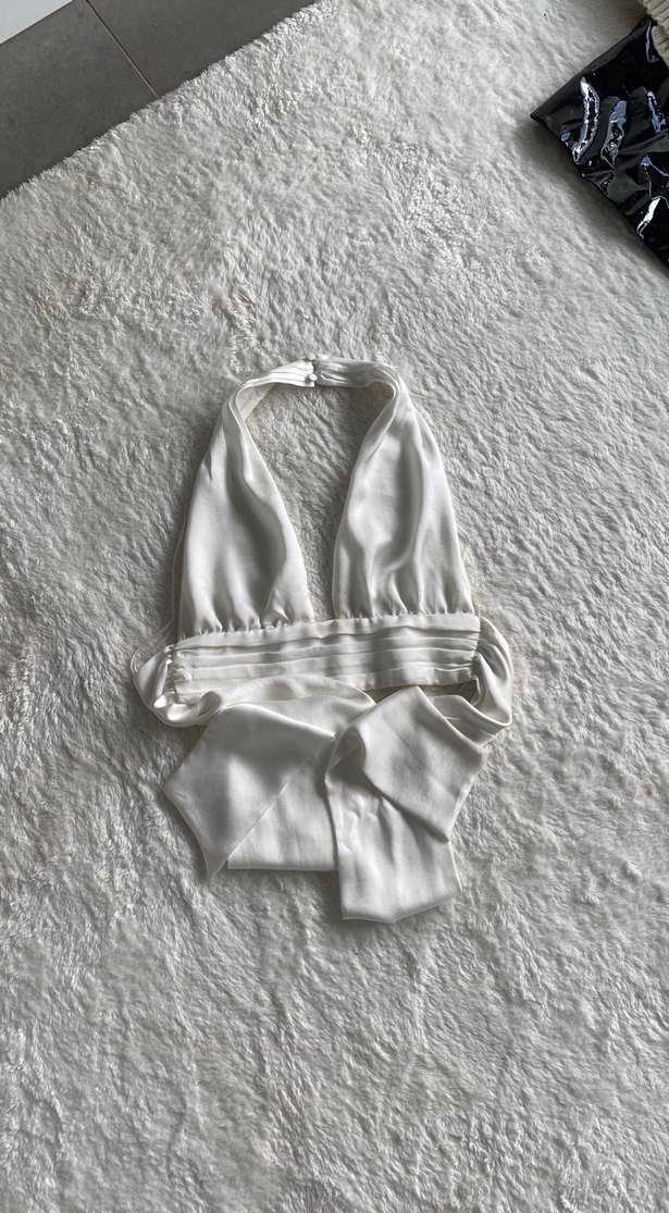 Beyaz renkli, sırt dekolteli, mini boy, bohem tarzda crop. İnce askılı ve sade desensiz yapısı ile minimalist bir görünüm sunar. Ceket içlerine veya jean üstüne saten şık crop