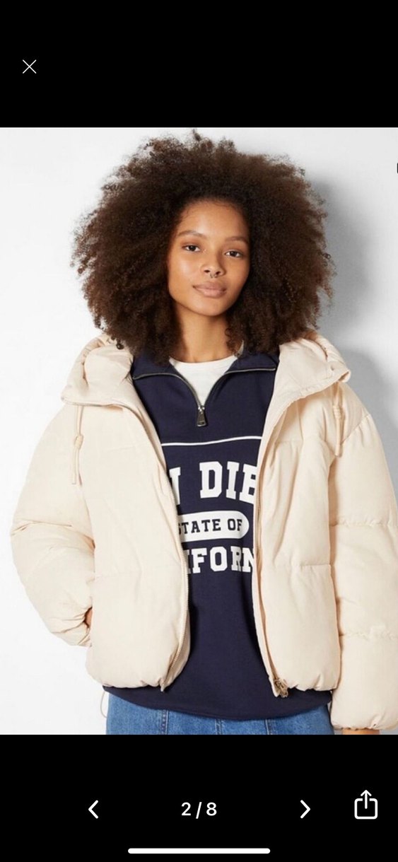 Beyaz şişme ceket, yuvarlak yaka ve uzun kollu, bol kesim ve yumuşak, sıcak kumaştan üretilmiştir. , günlük kullanıma uygundur.