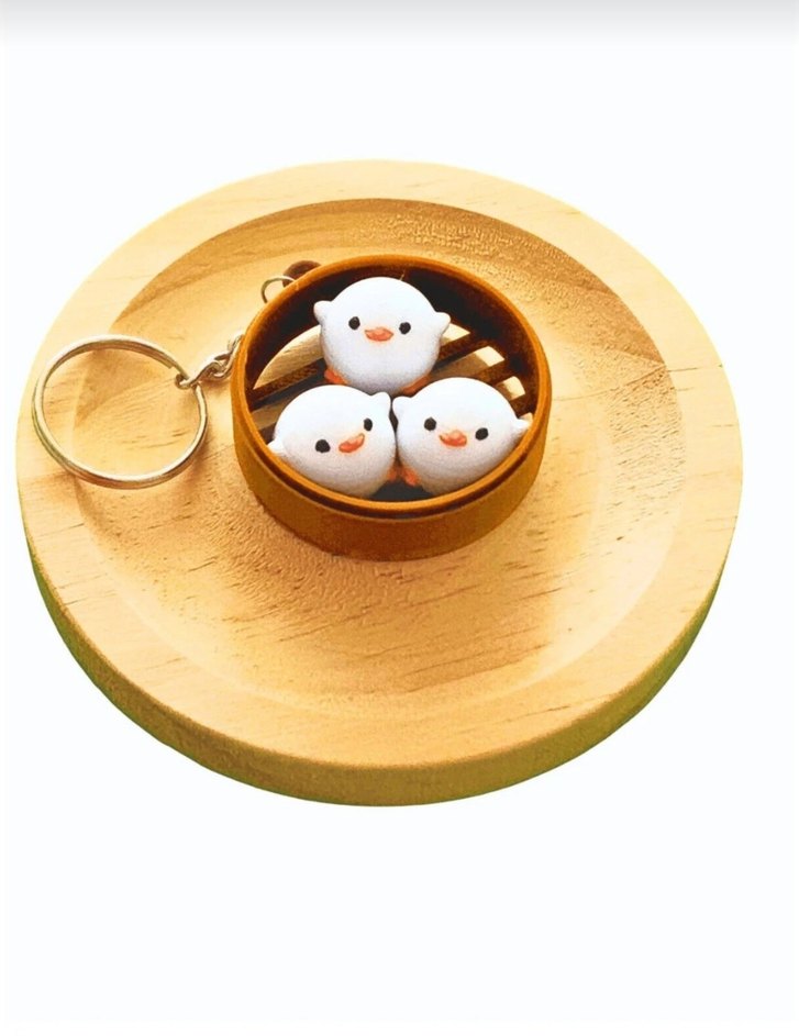 Yuvarlak çerçeve içinde üç beyaz şişme minik kuş bulunan, metal halka ile bağlanan sade ve rahat tarzda anahtarlık.