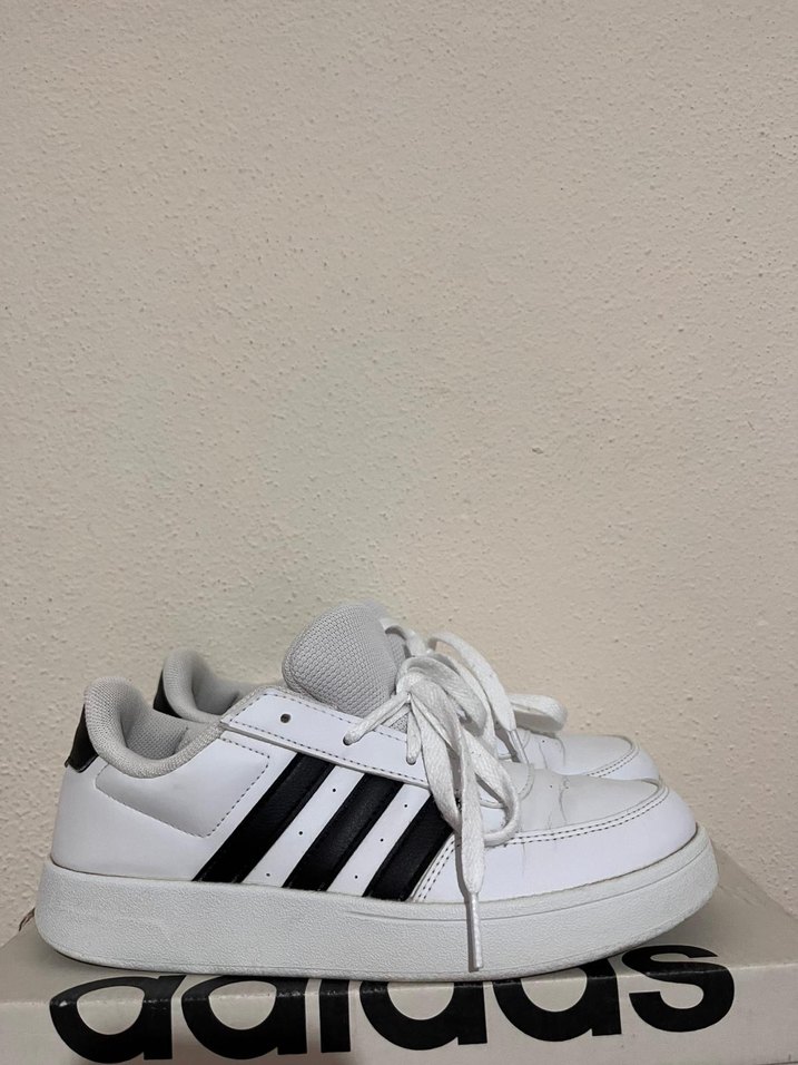 Beyaz Adidas kadın spor ayakkabısı, siyah çizgiler, düz kauçuk taban ve bağcıklı, spor ve günlük sokak stili için uygun.