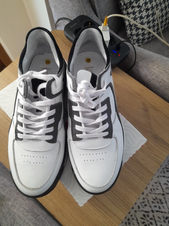 Beyaz ve siyah renkte, bağcıklı ve erkek spor ayakkabısı, kauçuk malzemeden üretilmiştir. Spor ve sokak stili için uygundur.