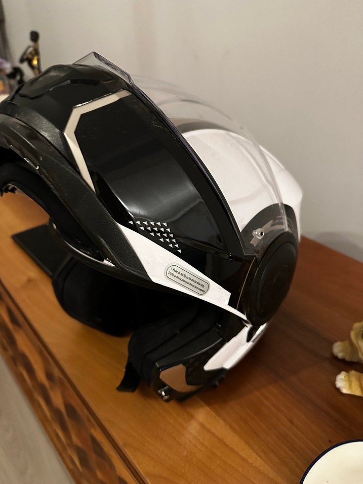 Bu avangart motosiklet kaskı, baskılı deseni ve tokalı kapanışıyla dikkat çeker. Dayanıklı plastikten yapılmış, koyu ve beyaz renkleriyle şık bir görünüme sahiptir. ️
