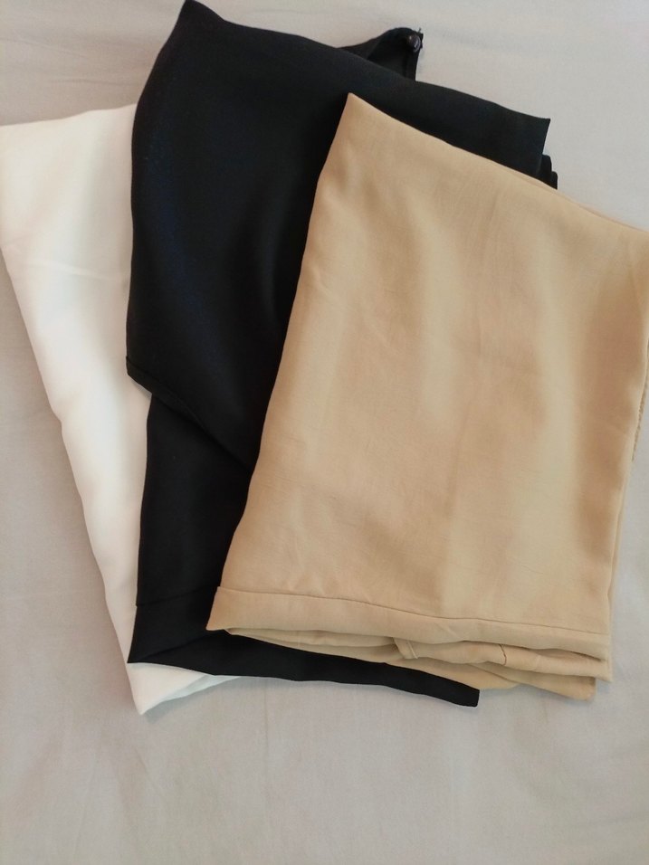 Beyaz kolsuz bluz, yuvarlak yaka ve bol kesim ile sade, saten dokuda. Midi boyda,ceket içi kullanıma uygun 42 beden. 3 lü olarak fiyatı