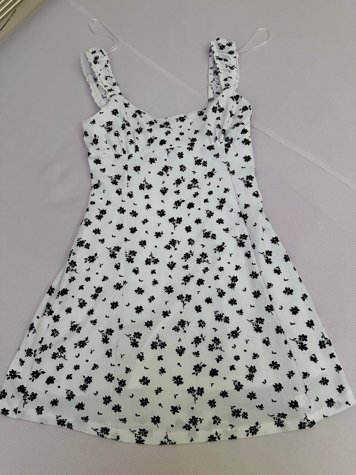 Beyaz Siyah Çiçek Desenli Fırfırlı Mini Elbise