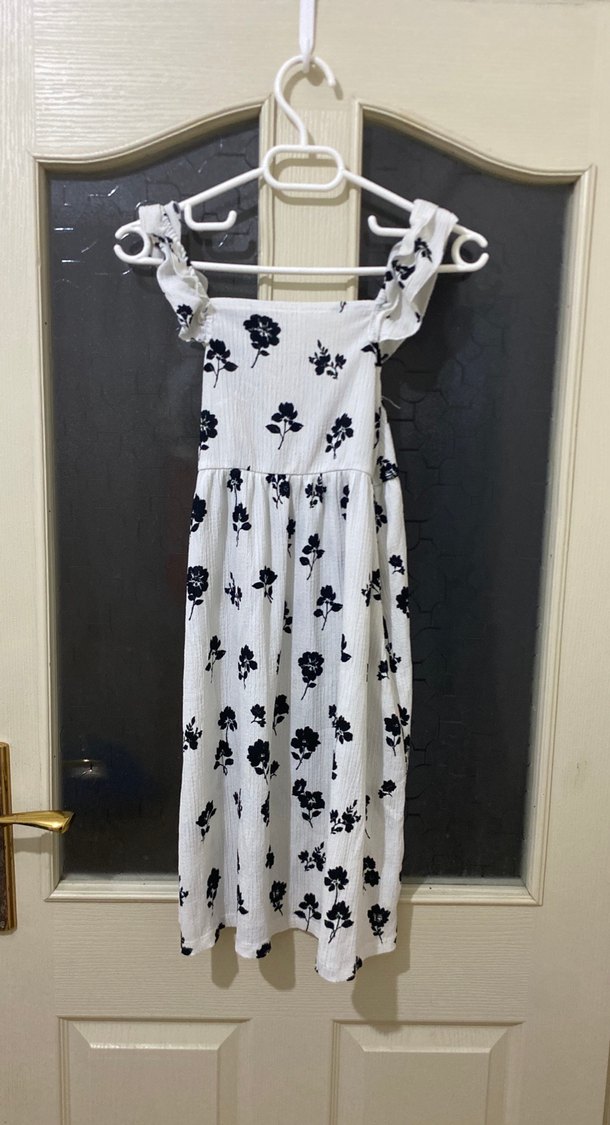 Bu uzun beyaz elbise, siyah çiçek desenleri, fırfırlı askılar ve straplez yaka ile tasarlanmıştır. Gevşek kesim ve yumuşak sentetik kumaştan üretilmiştir. Günlük kullanım için uygundur. Boy . 152 cm
