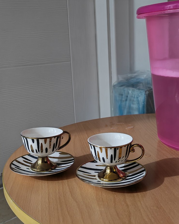 İki adet beyaz porselen fincan, siyah çizgiler ve altın detaylarla süslenmiş, yanında uyumlu tabaklarıyla birlikte sunulur. ☕