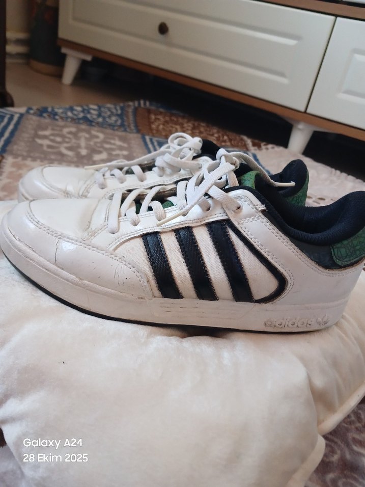 Beyaz siyah çizgili bağcıklı, kauçuk tabanlı erkek spor ayakkabısı. Spor ve günlük sokak tarzı için uygundur. orijinal ürün kusurları fotoda belirtim