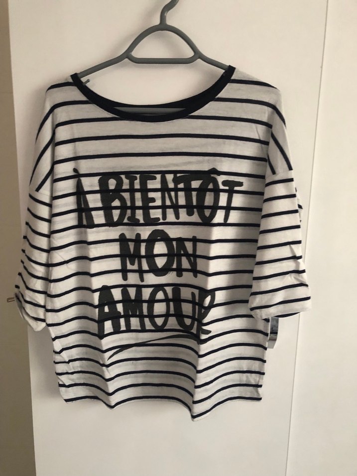 Beyaz siyah yatay çizgili tişört, önünde Fransızca baskılı yazı bulunur. Kısa kollu, yuvarlak yaka ve rahat bol kesimdir. Pamuklu, yumuşak kumaştan yapılmıştır.