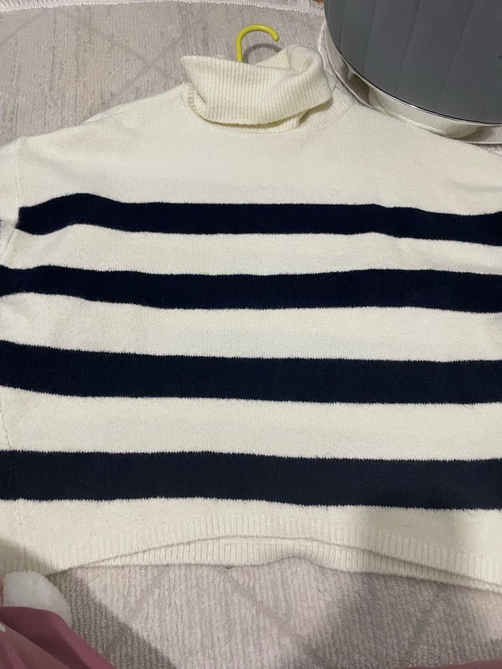 Beyaz Siyah Çizgili Boğazlı Kadın Kazak