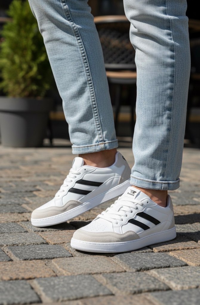 Beyaz renkli, siyah çizgili ve bağcıklı erkek sneakers. Denim dokusuyla sokak stiline uygun, rahat ve şık bir model. ️