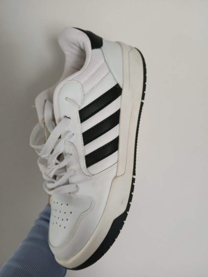 Orjinal degildir.Beyaz renkte, siyah çizgili, bağcıklı ve kauçuk tabanlı erkek spor ayakkabısı.Çok iyi durumdadır