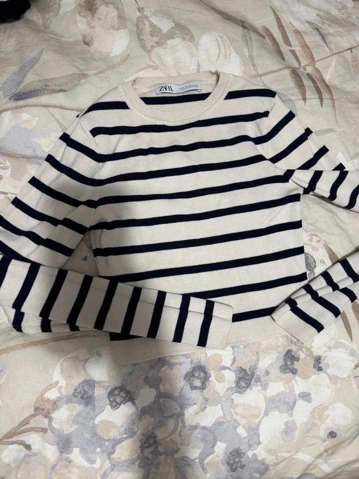 Yumuşak pamuktan yapılmış, uzun kollu, yuvarlak yakalı, beyaz siyah çizgili ince örgü kazak. Fitted ve midi uzunlukta, günlük kullanıma uygun.
