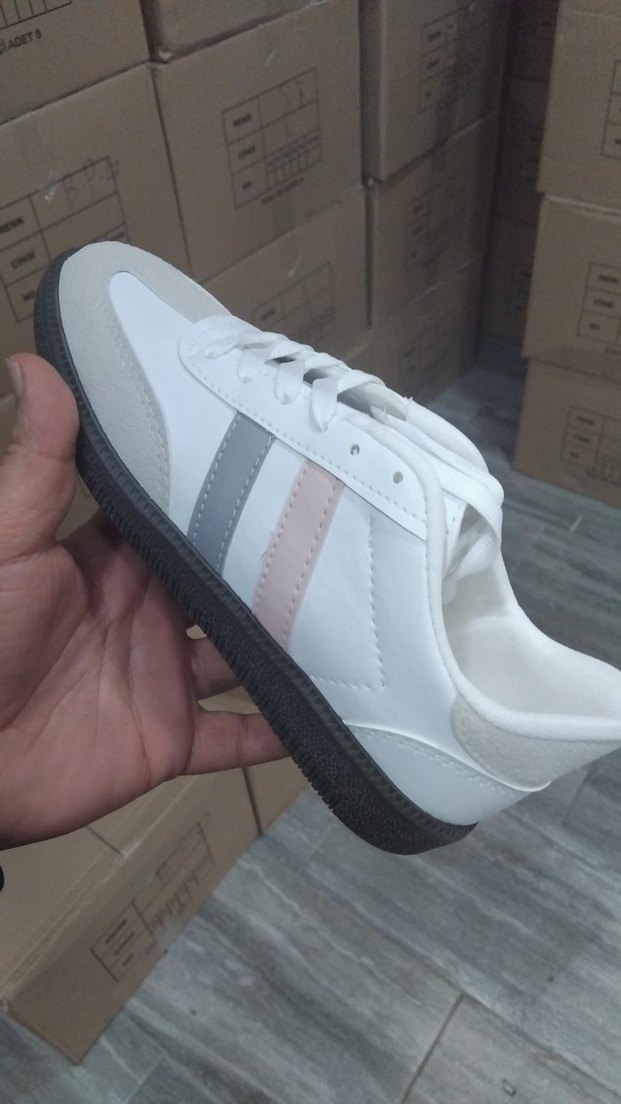Beyaz renkte, siyah çizgili ve kauçuk tabanlı kadın spor ayakkabısı. Bağcıklı yapısıyla rahat kullanım sağlar.