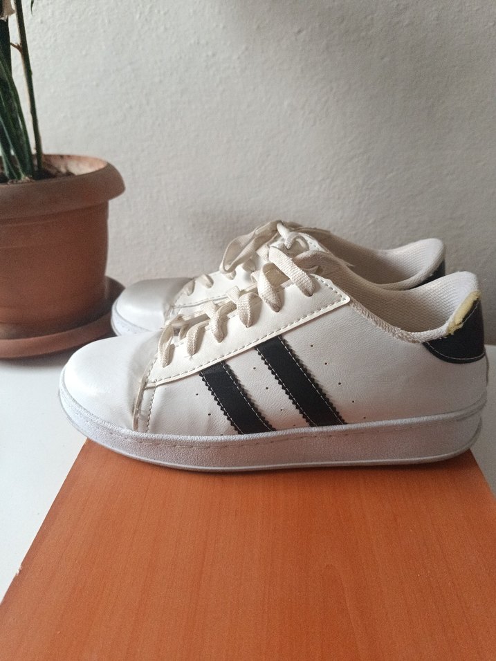 Beyaz kadın spor ayakkabısı, siyah çizgilerle, düz kauçuk taban ve bağcıklı tasarıma sahip. Günlük rahat kullanım için uygundur.