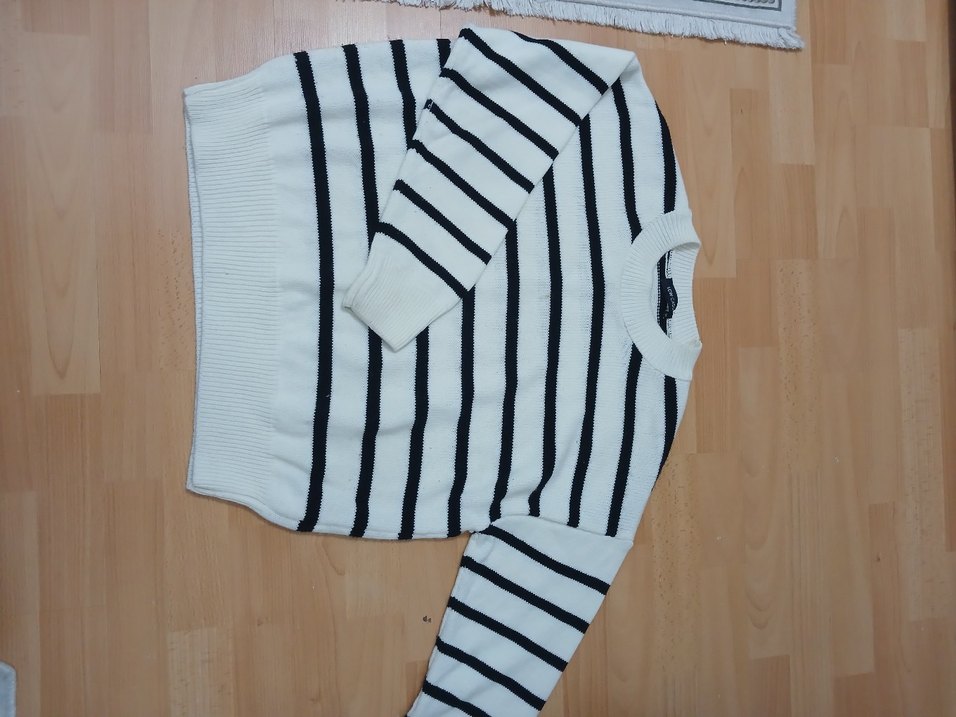 Pamuklu, uzun kollu, bisiklet yaka, beyaz üzerine siyah çizgili, rahat kesim kadın triko kazak. Günlük kullanıma uygundur.
