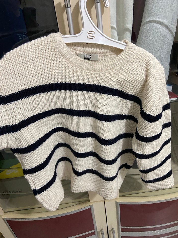 Beyaz renkli, siyah çizgili örgü kadın kazak, yuvarlak yakalı, uzun kollu ve salaş kesimdir. Rahat sokak stiline uygundur.