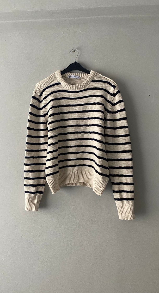 Çizgili desenli, uzun kollu ve yuvarlak yakalı kadın kazak. Örgü kumaştan, bol kesim ve normal boyda, günlük rahat kullanım için uygundur. Beyaz ve siyah renkleriyle Paris tarzı sokak modası havası verir. Omzumda düğme detayı var