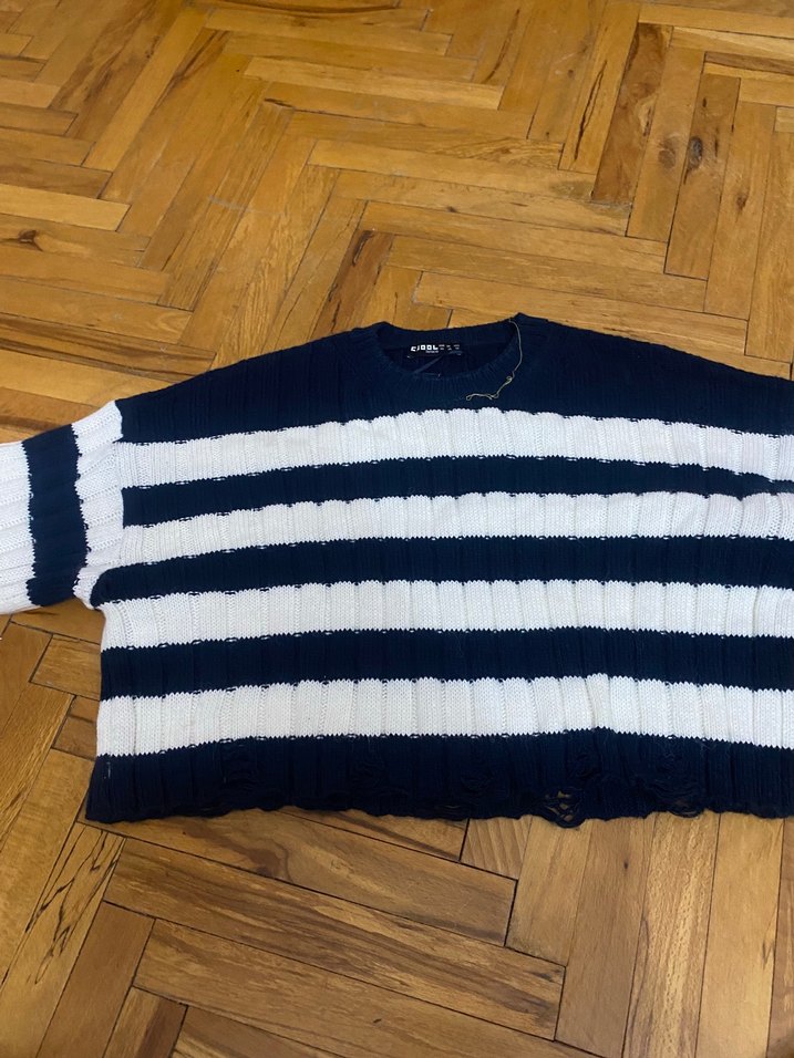 Örgü kumaştan, uzun kollu, bisiklet yaka, bol kesim beyaz siyah çizgili kadın kazak. Rahat ve günlük kullanıma uygun.