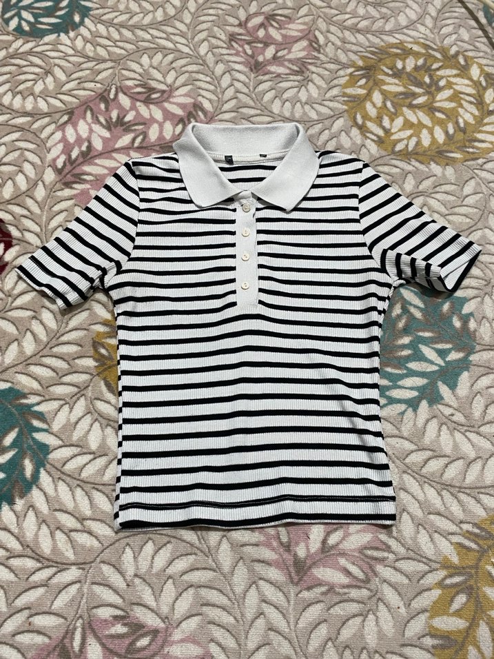 Pamuk kumaştan kısa kollu, düğmeli yakalı ve siyah beyaz çizgili polo tişört, rahat sokak tarzı için uygun.