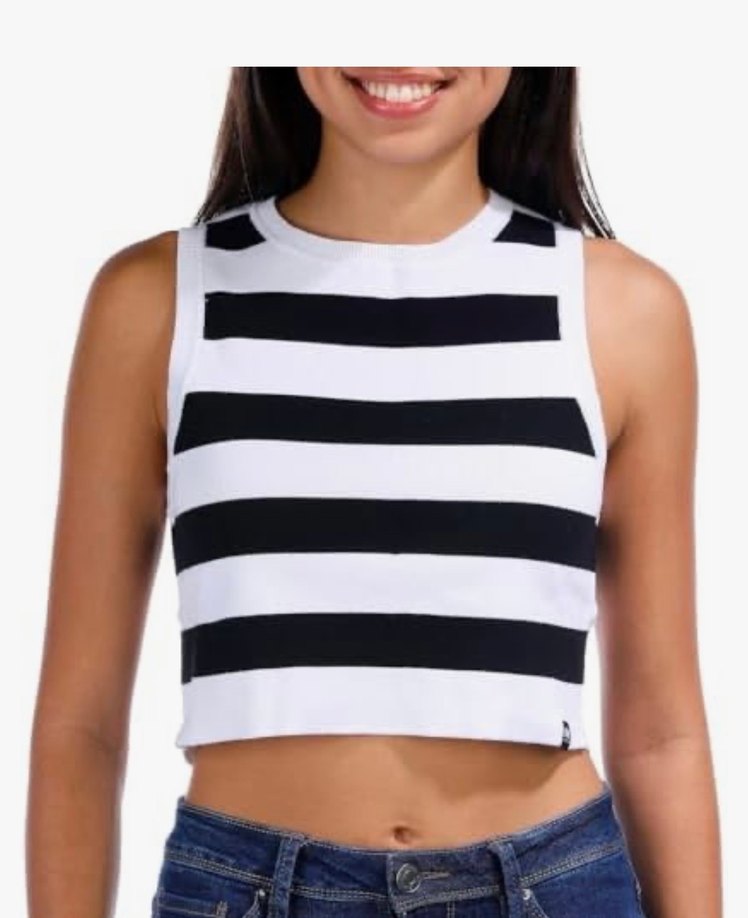 Yüksek yakalı, kolsuz crop top. Beyaz zemin üzerinde koyu yatay çizgiler bulunur. Triko vücuda oturan kesim. Günlük rahat ve sokak stiline uygun. Marka temsilidir