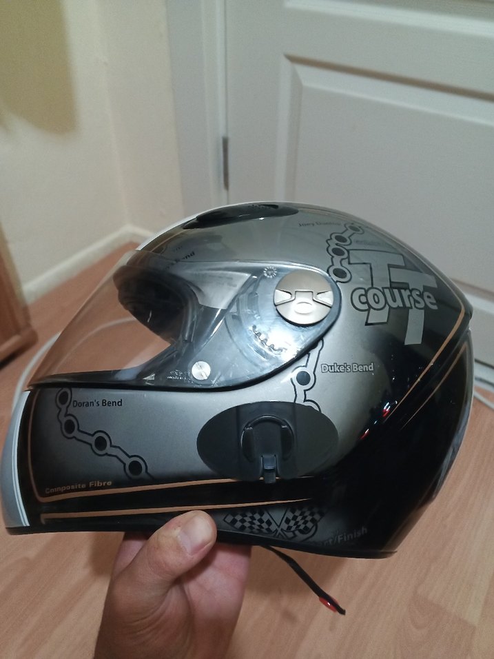 Beyaz ve gri desenli plastik malzemeden yapılmış, tokalı biker kask. Minimalist ve rock punk havası sunar, tonlu vizöre sahiptir. ️