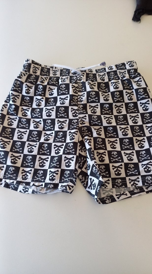 Erkek çocuklar için beyaz, siyah kafatası desenli kareli mayo şortu. Hızlı kuruyan kumaştan üretilmiştir. markasini k estik. kullanilmadi 9/10 yaş..Ama sistemde daha kucuk goruluyor.bel 34cm./Lastik gevseltilmeden/..boy 34 cm