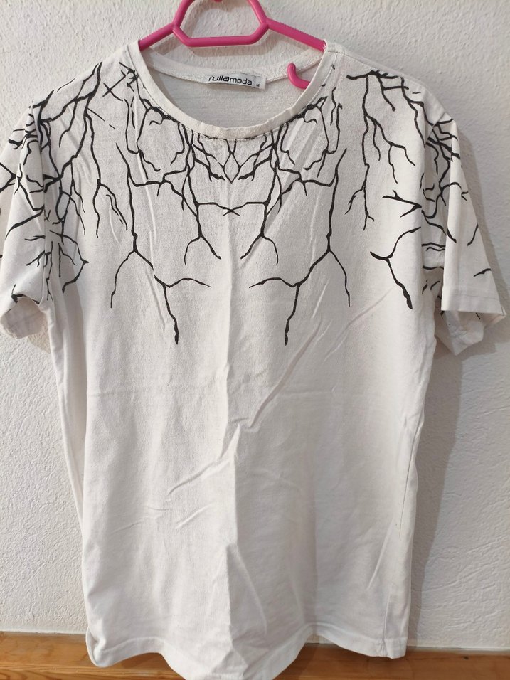 Pamuklu beyaz tişört, gevşek kesim, kısa kollu ve yuvarlak yakalı. Üzerinde siyah dal desenleri bulunur, günlük rahat stil için uygundur.