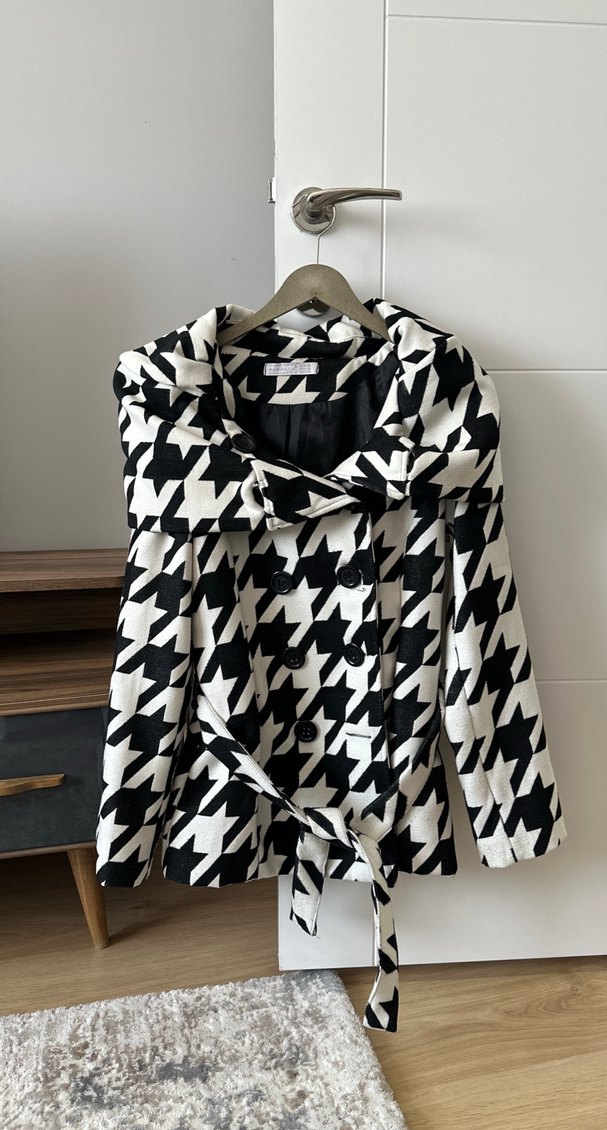 Siyah beyaz desenli, kuşaklı, normal boy midi şal yakalı . Uzun kollu ve kesimi düzenli, sentetik kumaştan yapılmıştır.