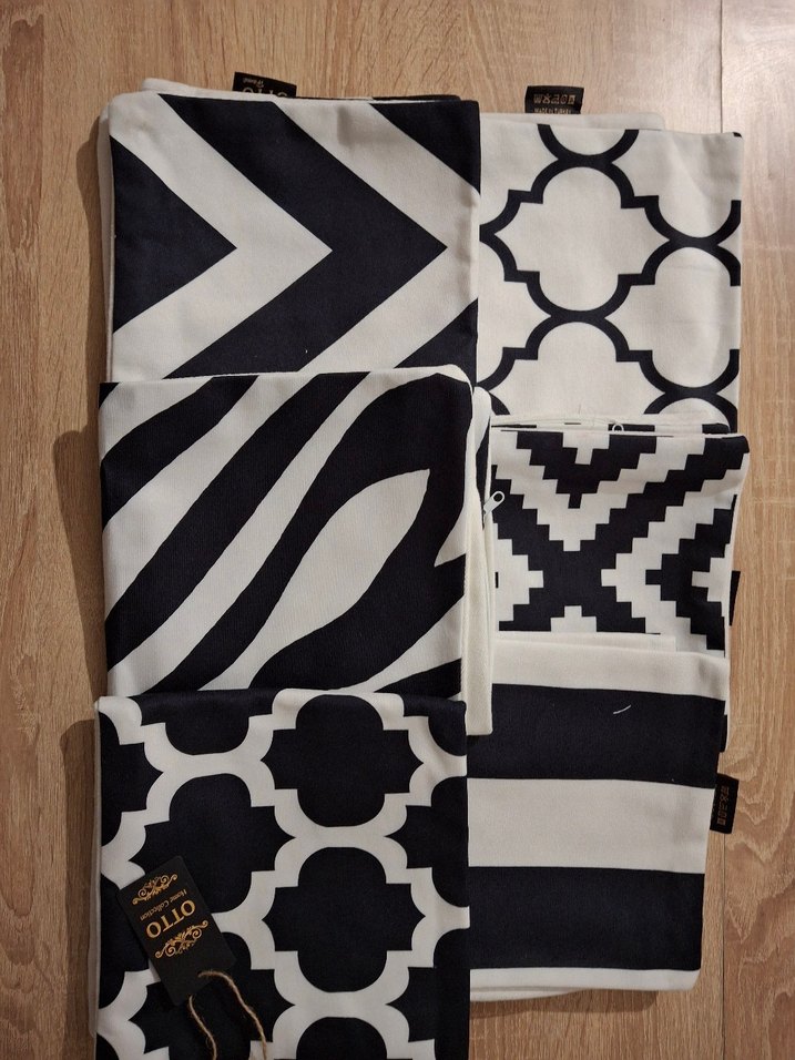 Beyaz zemin üzerine siyah, çeşitli geometrik ve soyut desenlerle modern yastık kılıfları. ️6 adet toplam fiyatıdır.