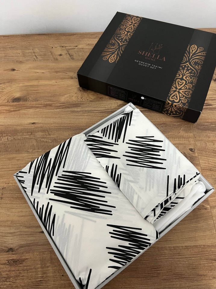 Beyaz zemin üzerine siyah desenli, SHIELLA markalı nevresim ve çarşaf takımı. Canlı koyu çizgilerle şık bir görünüm sunar. Çift kişiliktir