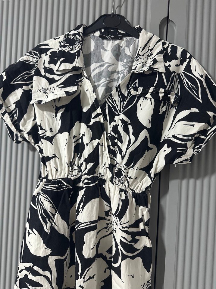 Hiçbir kusuru yoktur. Kadınlar için bol kesim, V yaka, kısa kollu, siyah beyaz baskılı uzun günlük elbise. Astarsızdır,uygun iç çamaşırıyla iç göstermez. Sokak stili için uygun