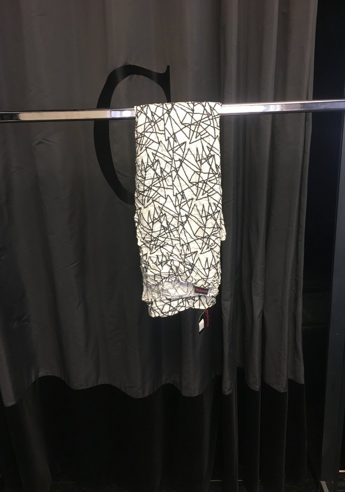Uzun beyaz şal siyah soyut desenle modern sokak stilini avant-garde dokunuşla buluşturuyor. Dilerseniz pareo onara kullanılanıla bilir
