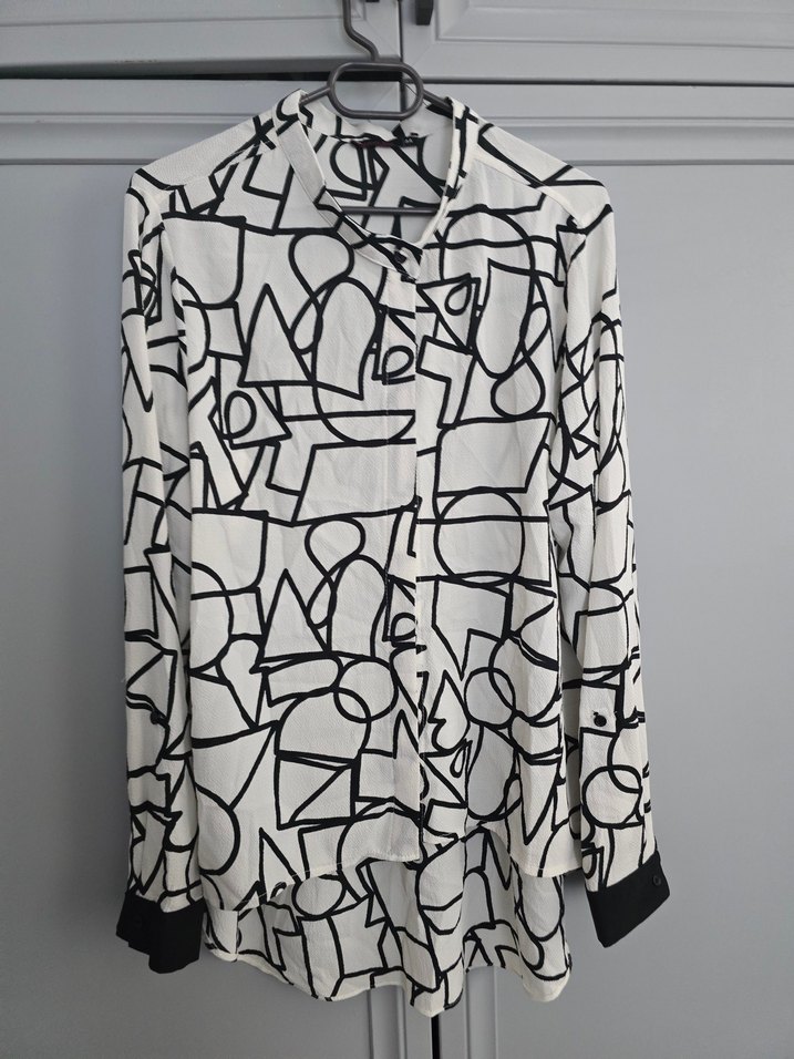 Beyaz zemin üzerine siyah soyut desenler, uzun kollu ve V yaka tasarımlı, rahat kesim kadın gömleği. Günlük kullanıma uygun, modern sokak stilini yansıtır.