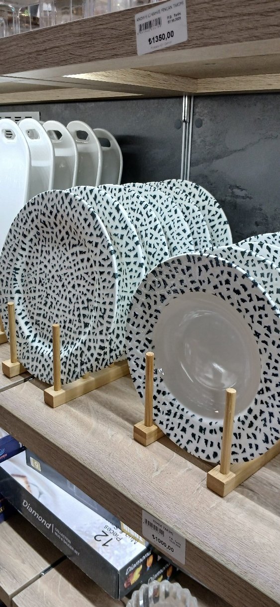 Beyaz zemin üzerine siyah desenli tabaklar, ahşap standlarda düzenli şekilde sergilenmiştir. ️
