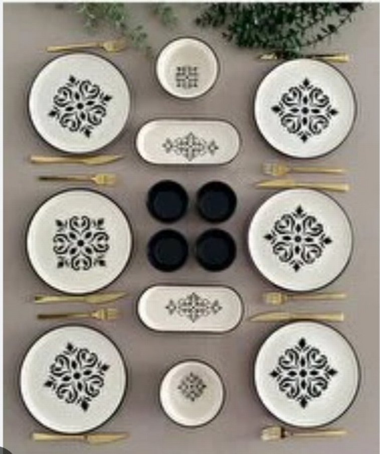Beyaz yemek kapları siyah dekoratif desenlerle, tabaklar ve küçük kaseler dahil, altın renkli çatal bıçaklarla düzenlenmiş. ️14 parçadan oluşur kutusu vardır