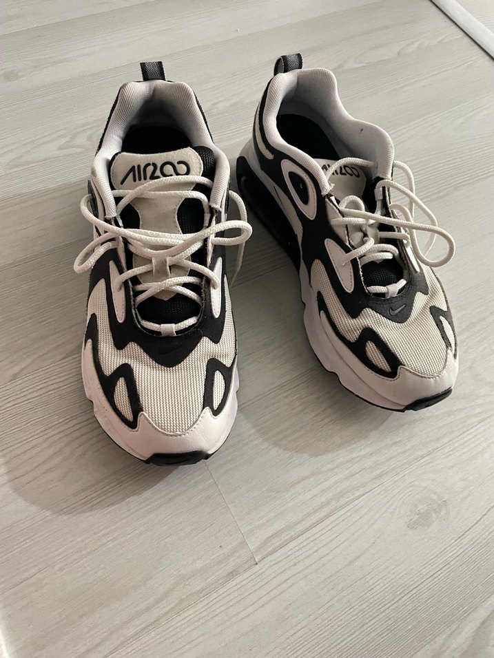 Beyaz siyah baskılı, bağcıklı yüksek topuklu erkek spor ayakkabısı. Kauçuk tabanlı, spor ve sokak stiline uygun.