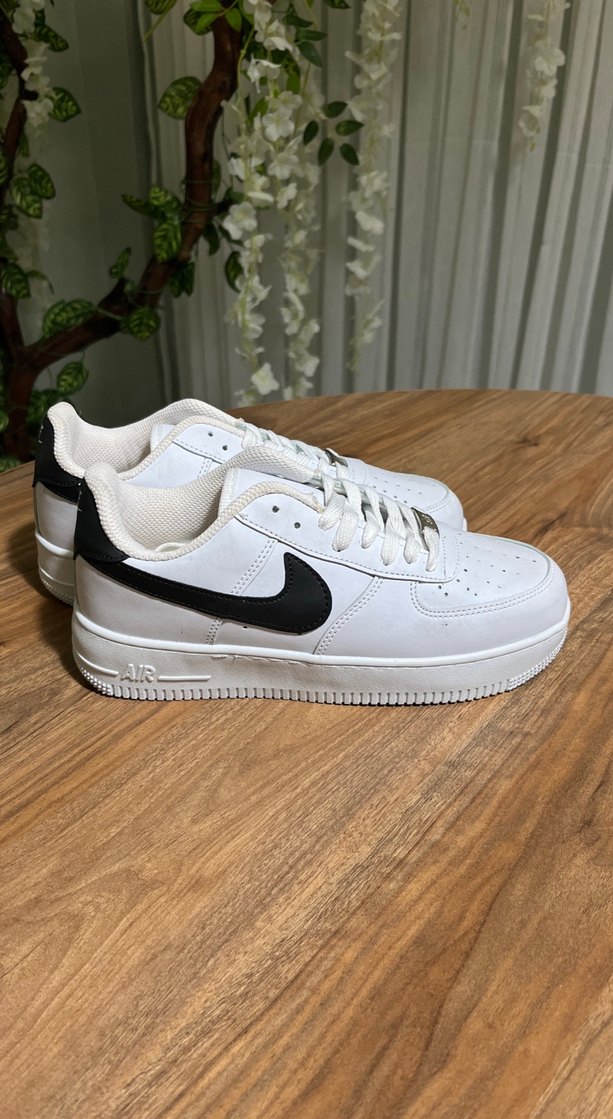 Beyaz ve siyah detaylı, ince topuklu ve kauçuk tabanlı spor ayakkabısı. Spor ve günlük sokak stili için rahat ve şık.