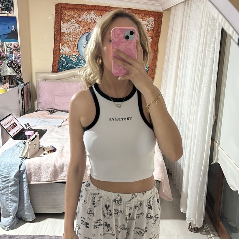 Siyah detaylı beyaz, straplez ve kolsuz crop top, yumuşak sentetik kumaştan, rahat sokak stili için uygun. ✨