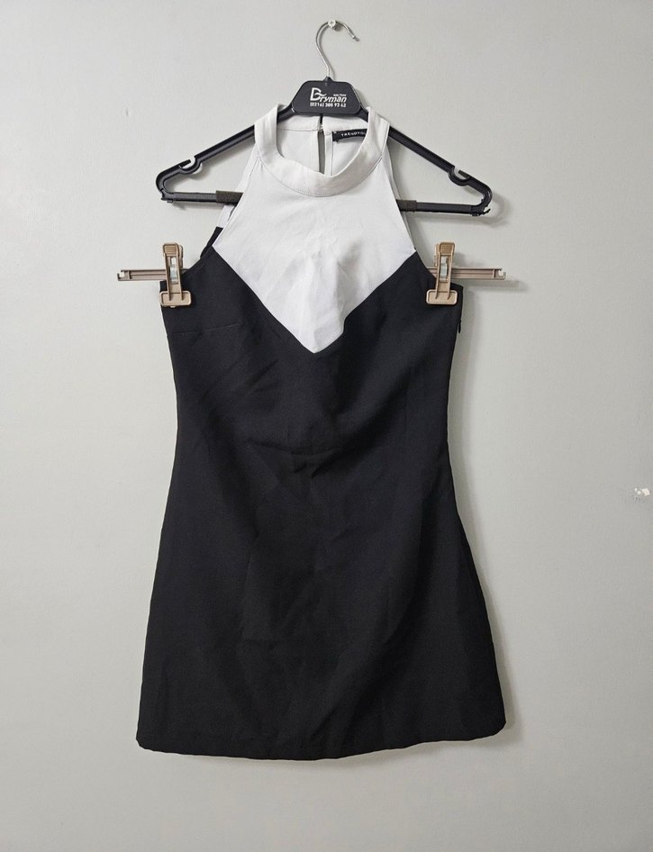 Drapeli tasarıma sahip, beyaz ve siyah sentetik kumaştan yapılmış, kolsuz ve yüksek yakalı mini elbise. Fitted kesimle şık ve goth tarzında.