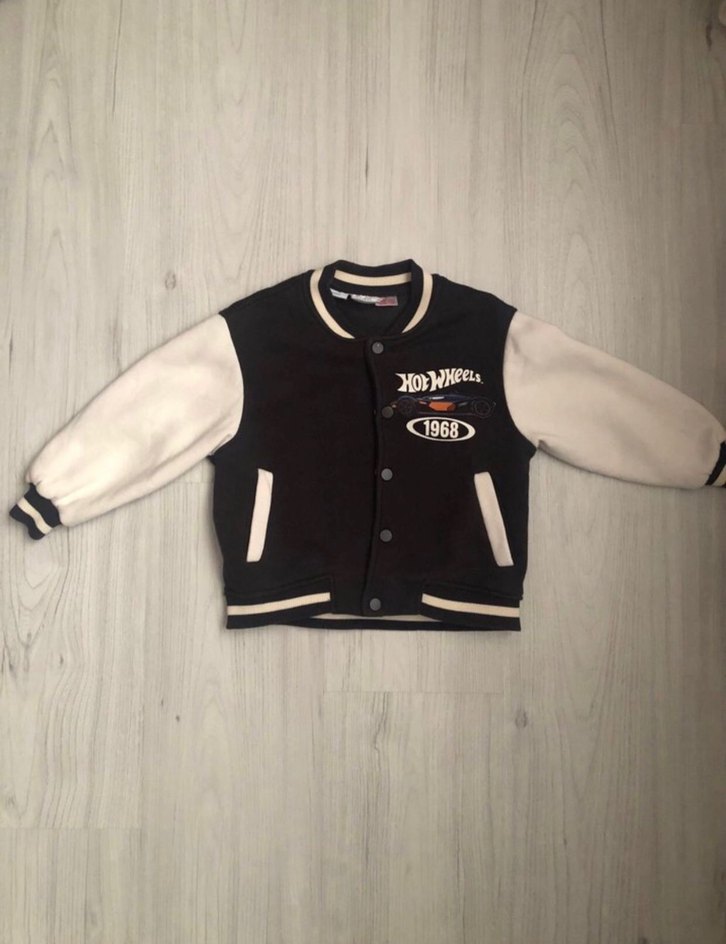 Dar kesim, düğmeli erkek çocuk sweatshirtü, yuvarlak yaka ve yumuşak kumaştan üretilmiştir. Baskılı Hot Wheels deseni ve beyaz kolları vardır.