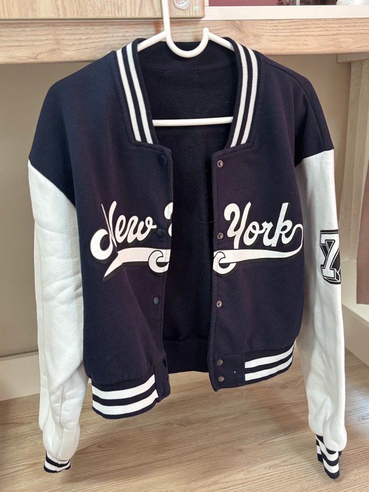 Bol kesim, uzun kollu, bisiklet yaka ve cırt cırt detaylı ceket. Önünde 'New York' baskılı, spor tarzda sokak giyimi için uygundur.