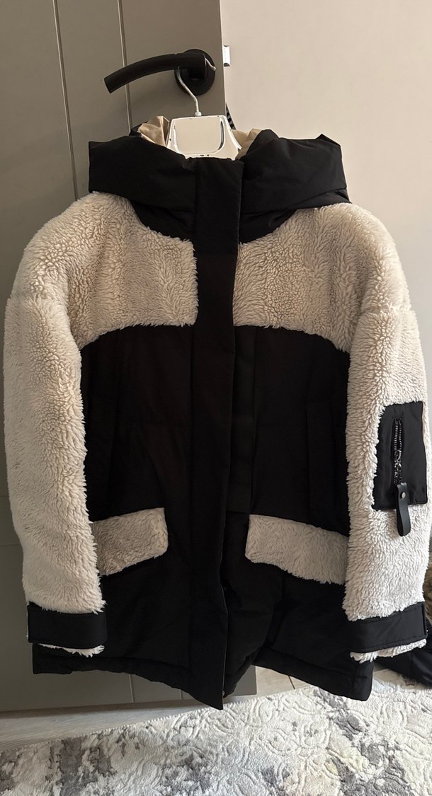 Beyaz Siyah Kapüşonlu Peluş Kışlık Mont