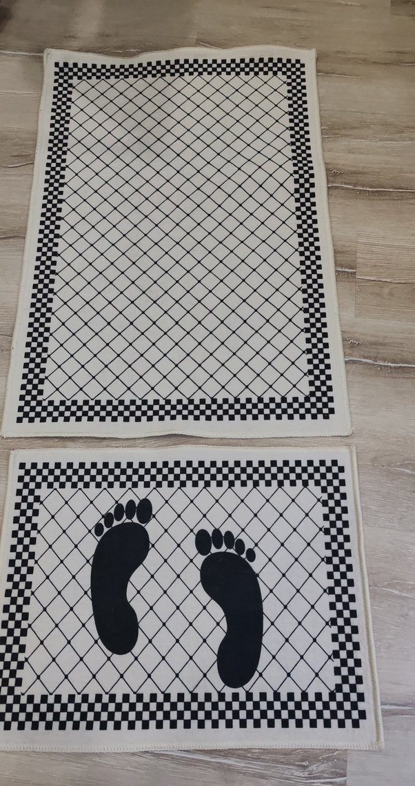 Klasik tarzda, beyaz zemin üzerinde koyu renk kareli desenli halı seti. Bir parçada ayak izi motifi bulunur. 2li Banyo takımıdir yenidir etiketi mevcut degildir