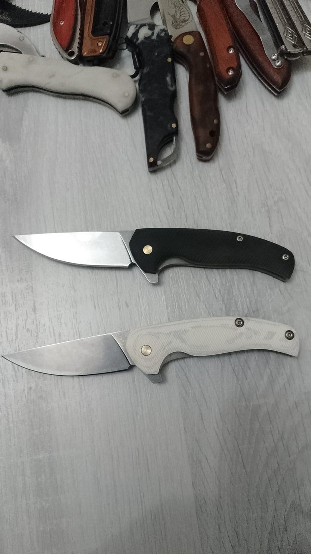 beyaz siyah saplı, keskin bıçakları olan iki katlanabilir cep bıçağı. Sapları rahat ve güvenli tutuş sağlar.