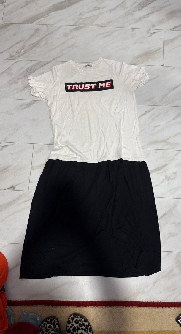 Beyaz üst kısmı kısa kollu ve bisiklet yaka, üzerinde 'TRUST ME' baskılıdır. Siyah etek kısmı kemerli ve midi boydadır.