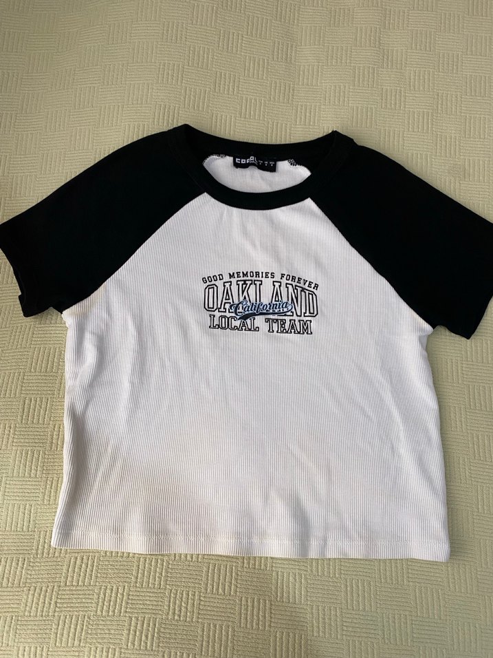 Pamuk kumaştan yapılmış, kısa kollu ve yuvarlak yakalı, beyaz gövdeli siyah kollu, Oakland Local Team baskılı dar kesim kadın tişörtü.