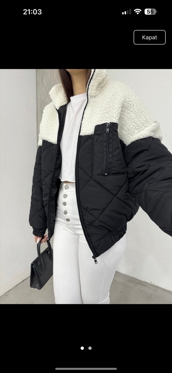Kadınlar için midi boy, bol kesim kışlık ceket. Yüksek yakalı, askılı kollu ve siyah kapitone kumaş ile beyaz tüylü detaylar içerir. Göğüste fermuarlı cep bulunur. ❄️