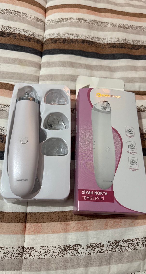 Beyaz renkli, siyah nokta temizliği için çeşitli başlıklara sahip kolay kullanımlı yüz temizleme cihazı. Tek düğme ile kontrol edilir. Kompakt saklama tepsisi dahil pille calısıyor hiç bir sorunu yok.