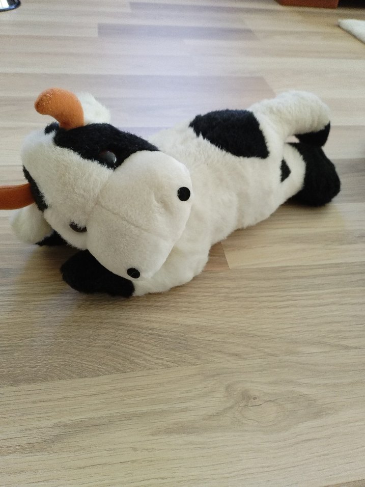 Yumuşak dokulu beyaz peluş inek oyuncak, siyah benekli ve küçük turuncu boynuzlu. Rahatlatıcı ve sevimli tasarımlı.