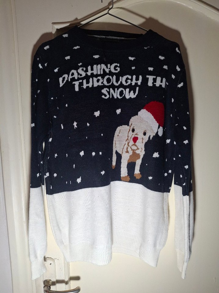 Yumuşak yünden örülmüş, uzun kollu, yuvarlak yakalı, bol kesim kadın kazak. Üzerinde Noel temalı baskı ve 'Dashing Through the Snow' yazısı bulunur. ❄️small beden ama kalıbı baya büyüktür